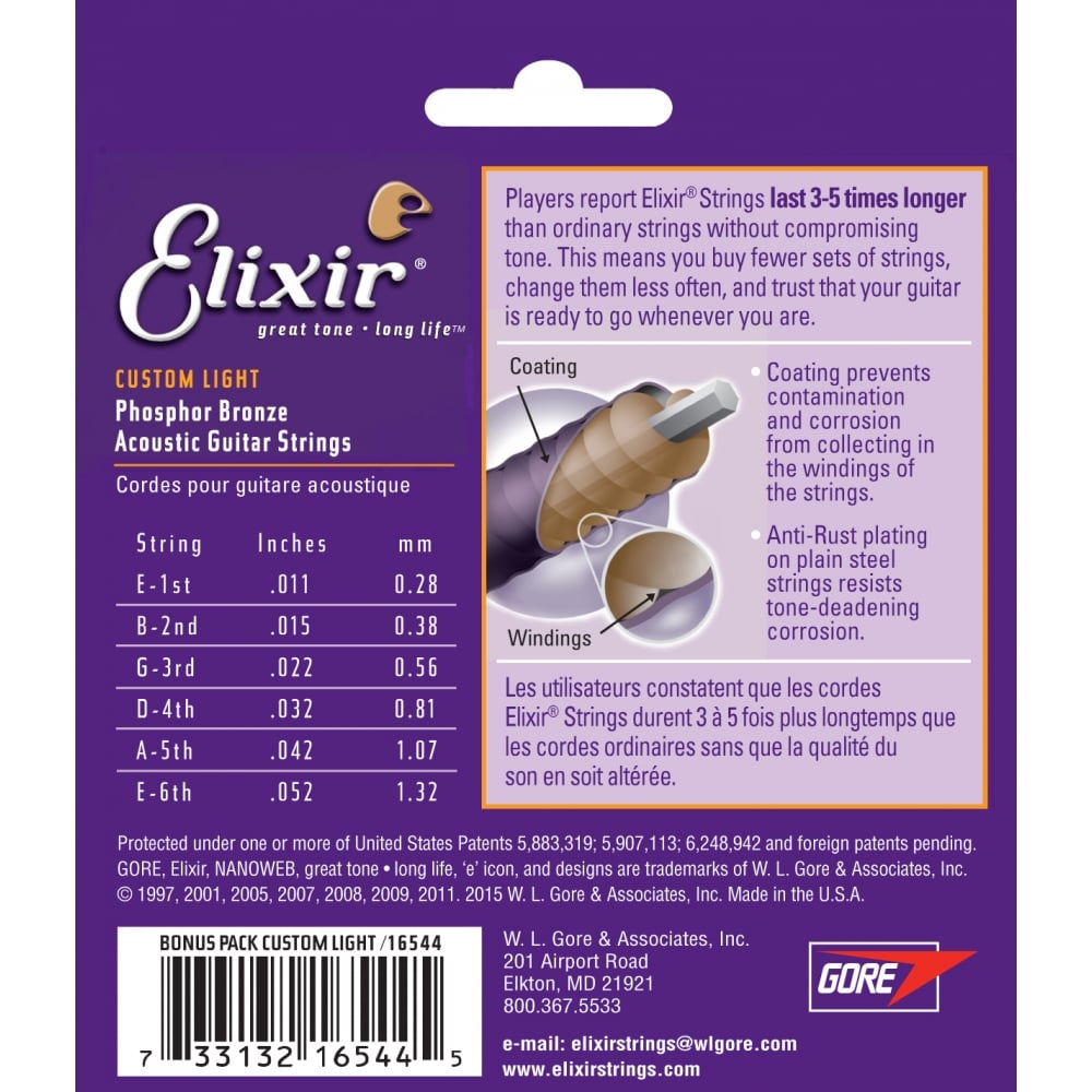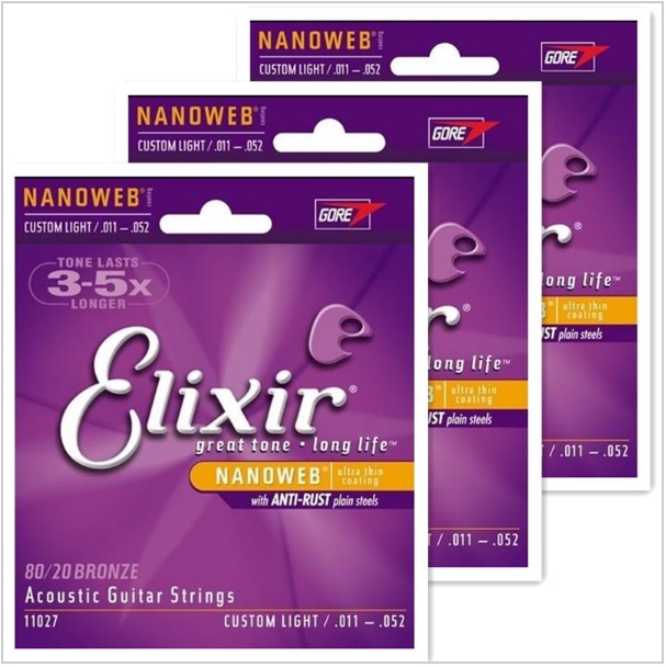 3 jeux de cordes ELIXIR Nanoweb Acoustique Custom-Light .011 – .052